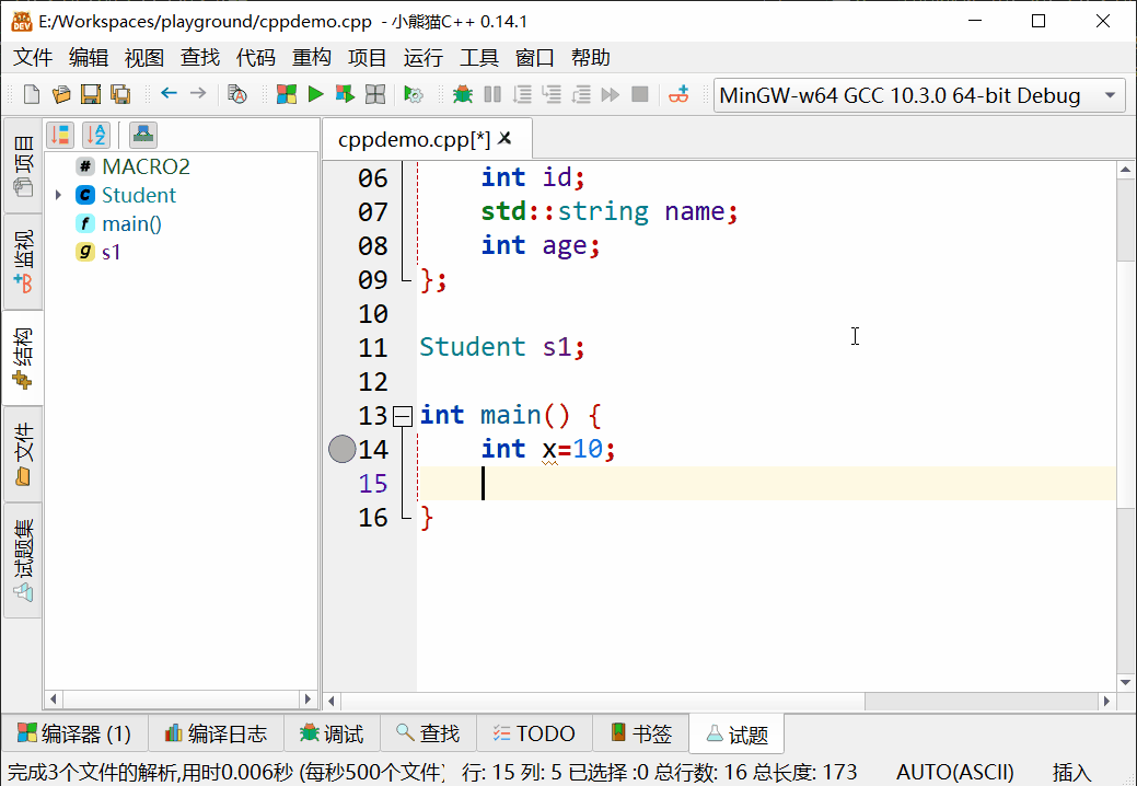 小熊猫C++无需复杂的安装和配置,打开即可直接编辑程序文件;无需创建项目,点击工具栏上按钮即可编译、运行和调试程序。