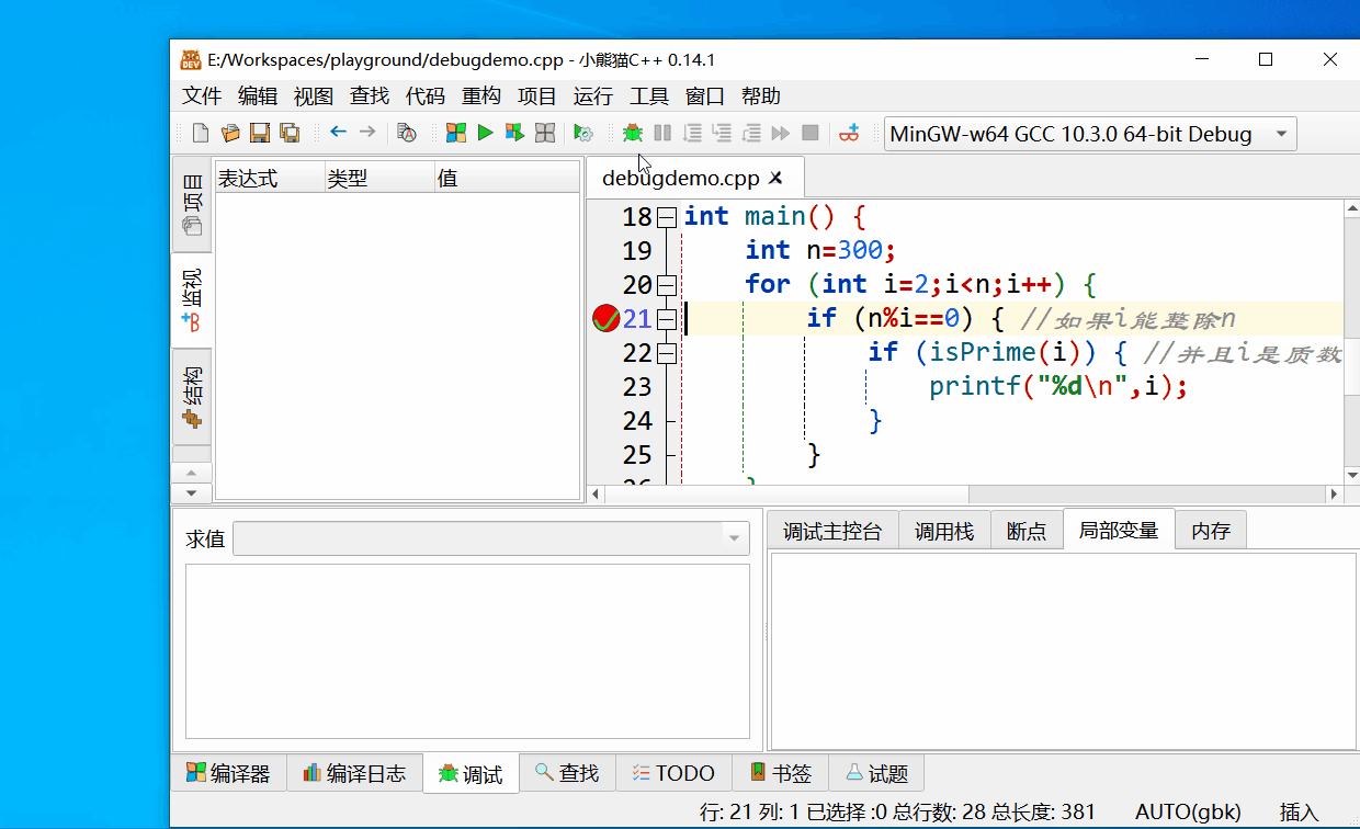 小熊猫C++提供完善的调试功能,包括控制程序执行、断点、监视变量和表达式、表达式求值、查看本地变量、查看和切换调用栈、查看和修改内存、查看CPU寄存器和反编译信息等。小熊猫C++甚至还可以重定向被调试程序的输入!