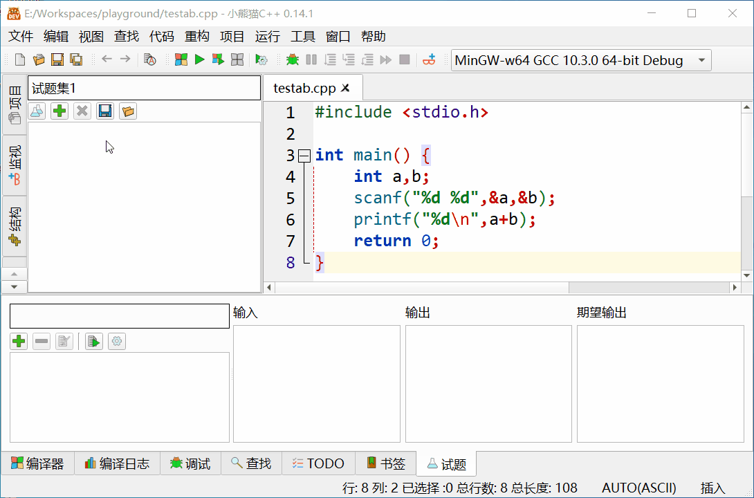 针对C/C++教学和竞赛需求,小熊猫C++专门提供了试题集和OJ功能:试题集功能让用户可以方便的组织管理、运行和测试C/C++练习程序;OJ功能让用户可以从OJ网站下载试题和配套的测试数据。